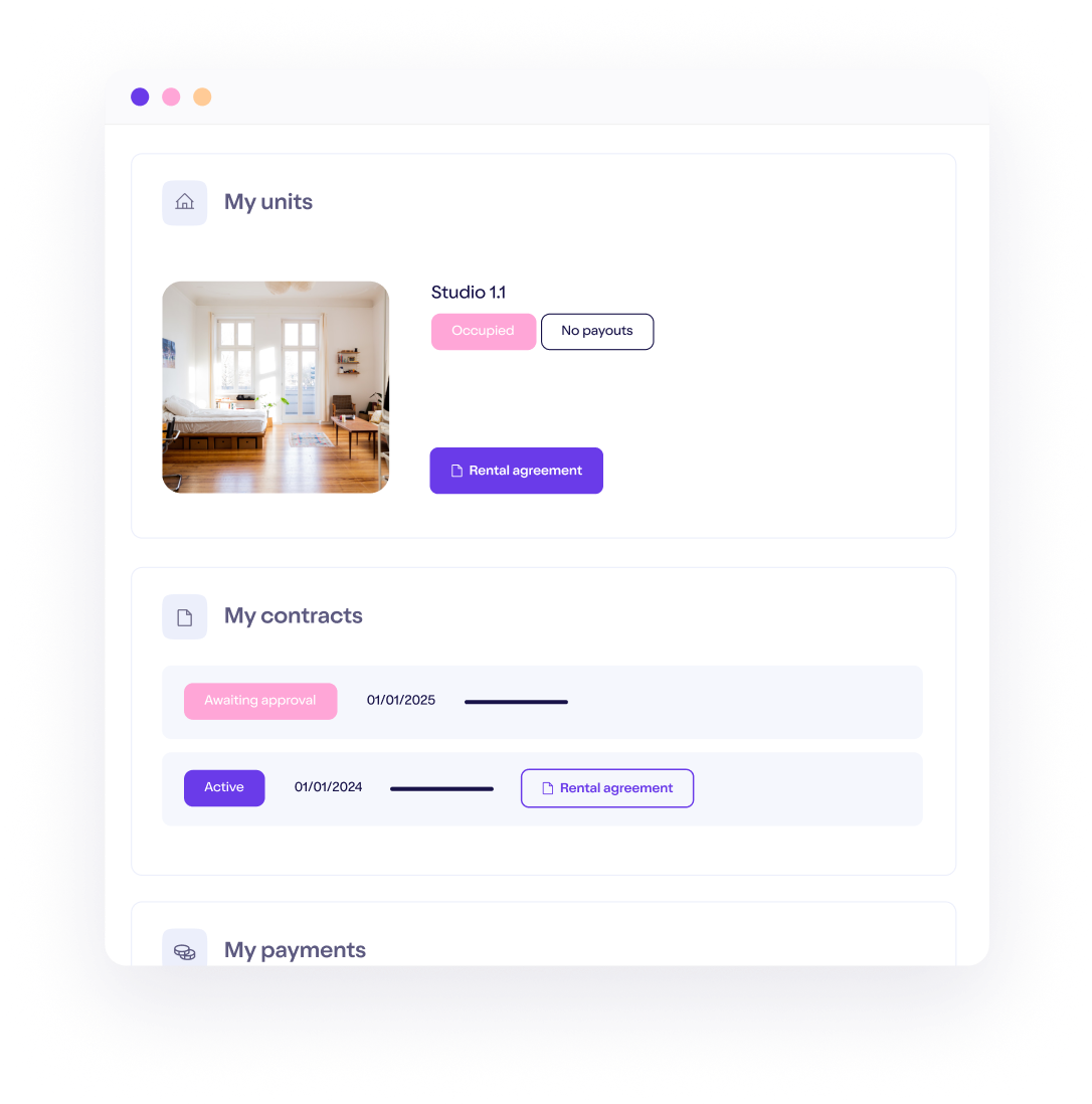 Provide property owners with full transparency and visibility into their investments. The portal offers detailed insights into purchased units, tenant information, and a complete overview of payments made to owners. Owners can also access contracts and easily submit requests, all through a clear and centralised interface.